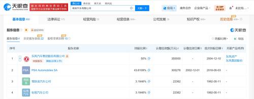 该公司成立于1992年5月,注册资本70亿人民币,经营范围含道路机动车辆生产、在线数据处理与交易处理业务、城市配送运输服务、汽车零部件及配件制造、汽车零部件研发、汽车零配件零售、新能源汽车整车销售、机动车修理和维护等。股东信息显示,该公司由东风汽车集团股份有限公司、PSA Automobiles SA、雪铁龙汽车公司、标致汽车公司共同持股。