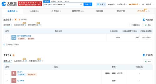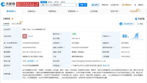 天眼查App显示,佳能(中山)办公设备有限公司成立于2001年6月,法定代表人为丸山元,注册资本580万美元,经营范围包括生产经营激光打印机、传真机、多功能机(含传真、复印、扫描、打印功能)及其相关半成品、零部件等。股东信息显示,该公司由日本佳能株式会社全资持股。年报信息显示,该公司2024年参保1656人,从2021年起参保人数逐年下降。