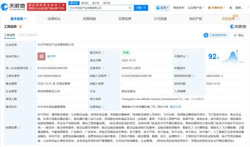 天眼查App显示,近日,长沙市低空产业发展有限公司成立,法定代表人为侯文学,注册资本2亿人民币,经营范围包括通用航空服务、公共航空运输、民用机场运营、民用航空器维修等。股东信息显示,该公司由长沙市交通投资控股集团有限公司、长沙城市发展集团有限公司、长沙数字集团有限公司、湖南湘江新区发展集团有限公司共同持股。