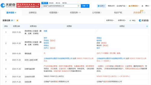 天眼查工商信息显示,近日,云南省产业投资基金有限责任公司发生工商变更,企业名称变更为云南省产业股权投资有限责任公司,注册资本由约39.9亿人民币增至约50.4亿人民币,增幅约26%,同时,部分主要人员发生变更。