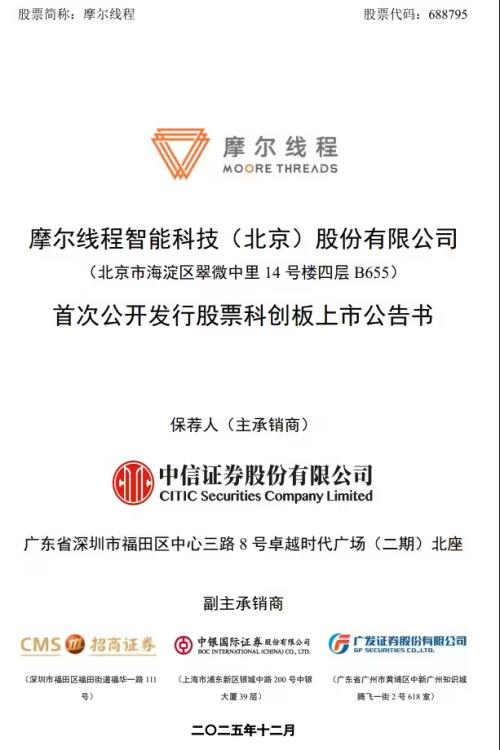 经上海证券交易所审核同意,摩尔线程智能科技(北京)股份有限公司发行的人民币普通股股票将于2025年12月5日在上海证券交易所科创板上市,证券代码为“688795”。