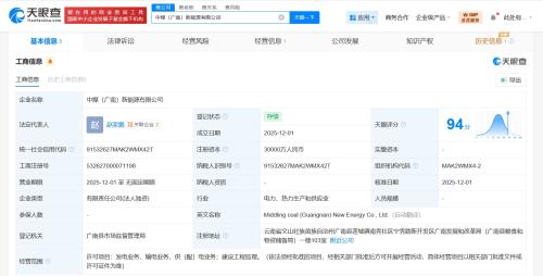 天眼查App显示,近日,中煤(广南)新能源有限公司成立,法定代表人为赵家鹏,注册资本3亿人民币,经营范围为发电业务、输电业务、供(配)电业务,建设工程监理。股权全景穿透图显示,该公司由中煤绿能科技(北京)有限公司全资持股,后者为中国中煤能源集团有限公司全资子公司。
