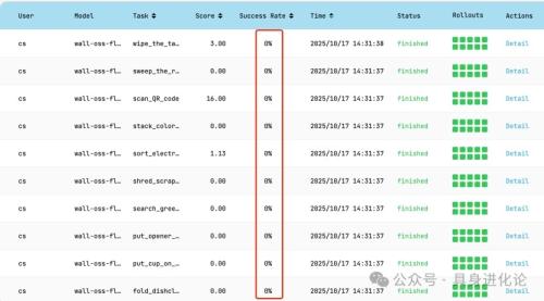相比之下,自变量的wall-oss-flow在相同条件下的表现明显偏弱。测评结果显示:wall-oss-flow共测试31次,其中2次成功率为60%,1次成功率为50%,1次成功率为20%,其余所有任务成功率均为0。