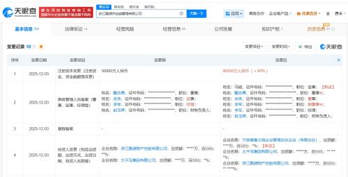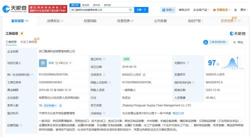 天眼查App显示,近日,浙江鹏源供应链管理有限公司发生工商变更,新增宁波星巢之链企业管理合伙企业(有限合伙)为股东,注册资本由5亿人民币增至9亿人民币,增幅80%,同时,多位高管发生变更。