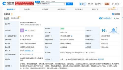 天眼查工商信息显示,近日,中远海运船员管理有限公司发生工商变更,韩超卸任法定代表人、董事长,由翁羿接任,注册资本由7亿人民币增至17亿人民币,增幅约143%,同时,多位高管发生变更。
