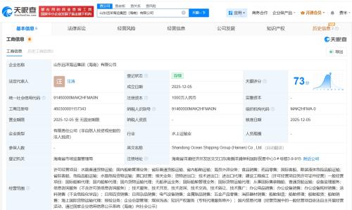 天眼查App显示,近日,山东远洋海运集团(海南)有限公司成立,法定代表人为汪涛,注册资本1000万人民币,经营范围包括水路普通货物运输、国内船舶管理业务、省际普通货船运输、省内船舶运输等,由山东远洋海运集团股份有限公司全资持股。