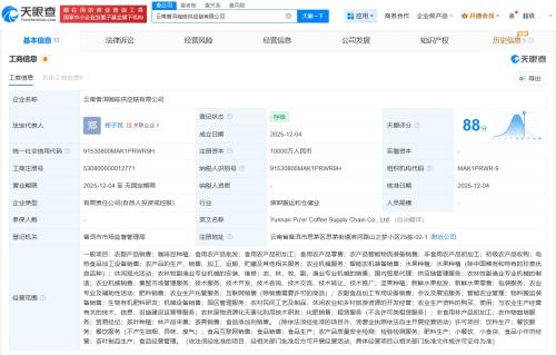 天眼查App显示,近日,云南普洱咖啡供应链有限公司成立,法定代表人为郑子民,注册资本1亿人民币,经营范围包括农副产品销售、咖啡豆种植、食用农产品批发、食用农产品初加工等。股东信息显示,该公...