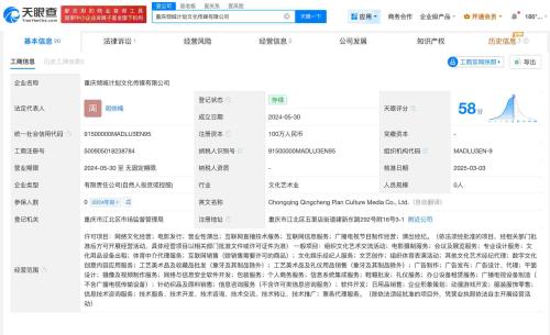 天眼查App显示,重庆倾城计划文化传媒有限公司成立于2024年5月,法定代表人为周帅楠,经营范围含网络文化经营、电影发行、营业性演出、互联网直播技术服务等。股东信息显示,该公司由周帅楠、韩晓雪共同持股。