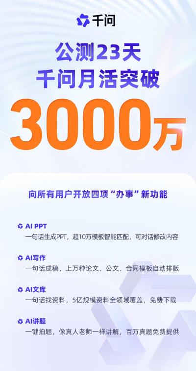 阿里巴巴官方信息显示,公测23天后,千问月活跃用户数(含APP、Web、PC端)已突破3000万。这也是全球增长最快的AI应用。