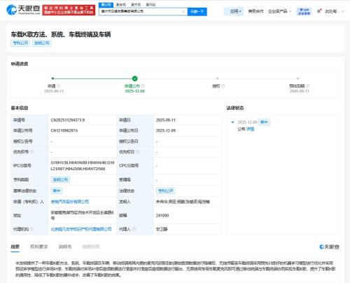 天眼查App显示,近日,奇瑞汽车股份有限公司申请的"车载K歌方法、系统、车载终端及车辆"专利公布。摘要显示,移动终端将其内置的麦克风获取到的原始音频数据进行降噪后,无线传输至车载终端采用预...