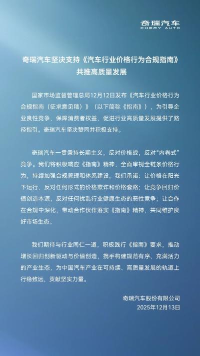奇瑞汽车坚决支持《汽车行业价格行为合规指南》共推高质量发展。