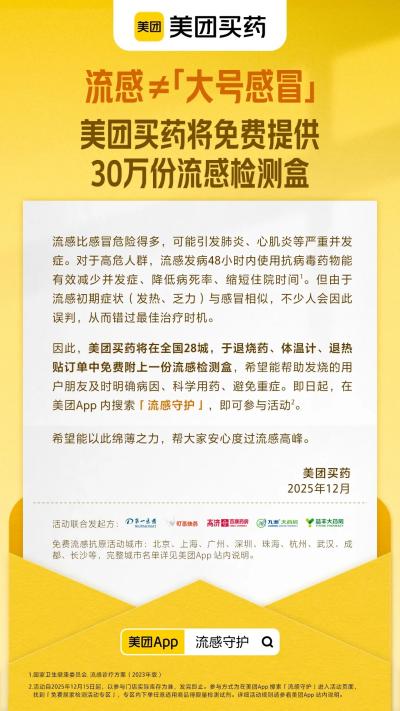 美团买药宣布,为协助公众应对流感,本周起将在全国28个城市的部分退烧药、体温计、退热贴等发烧类产品订单中,免费附上共30万份流感检测试剂。