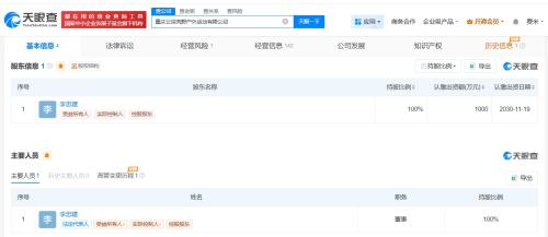 该公司成立于今年11月,法定代表人为李忠建,注册资本1000万人民币,经营范围包括健身休闲活动、体验式拓展活动及策划、食品销售等,由李忠建全资持股。
