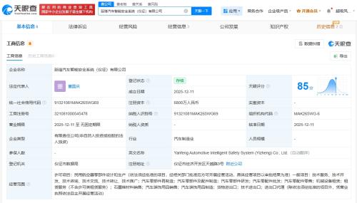 天眼查App显示,近日,延锋汽车智能安全系统(仪征)有限公司成立,法定代表人为董国庆,注册资本6800万人民币,经营范围包括民用航空器零部件设计和生产、汽车零部件及配件制造、石墨烯材料销售、汽车装饰用品销售等。股权全景穿透图显示,该公司由华域汽车(600741)旗下延锋汽车智能安全系统有限责任公司全资持股。