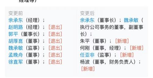 天眼查工商信息显示,12月12日,华为终端有限公司发生工商变更,郭平卸任董事长,由余承东接任,孟晚舟、徐直军等卸任董事,同时,多位高管发生变更。