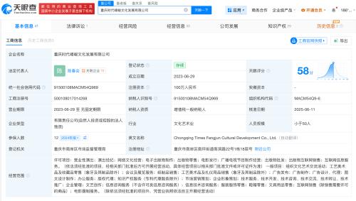 天眼查工商信息显示,重庆时代峰峻文化艺术发展有限公司成立于2023年6月,法定代表人为陈春会,注册资本100万人民币,经营范围包括营业性演出、演出经纪、网络文化经营等。