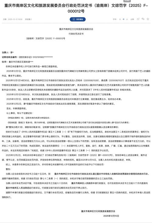 近日,重庆市南岸区文化和旅游发展委员会对廖某作出警告的行政处罚。违法事实显示,12月1日,重庆市南岸区文化和旅游发展委员会接到重庆时代峰峻文化传媒有限公司罗女士致电称楼下游摊未经其公司许可,发行其旗下艺人的摄影作品,要求予以查处。执法人员在现场发现该游摊的经营者为廖某,其未经权利人重庆时代峰峻文化艺术发展有限公司的许可销售其旗下艺人的摄影作品100余份。12月2日,廖某到重庆市南岸区文化市场综合行政执法支队接受调查,其在调查询问笔录中承认了侵权的事实。
