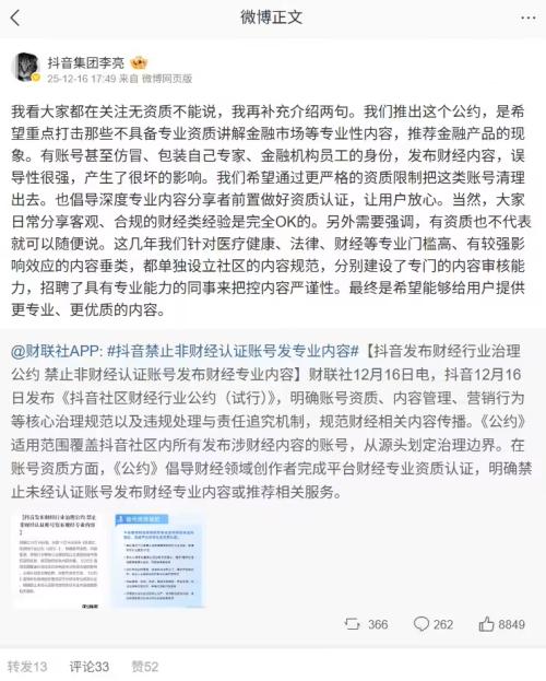 对此,抖音集团副总裁李亮发文称,推出财经行业治理公约,是希望重点打击那些不具备专业资质讲解金融市场等专业性内容,推荐金融产品的现象。另外需要强调的是,有资质也不代表就可以随便说。