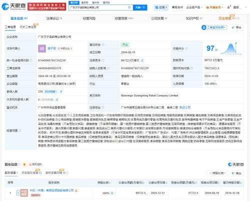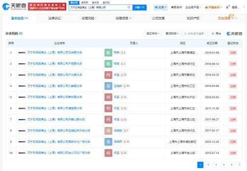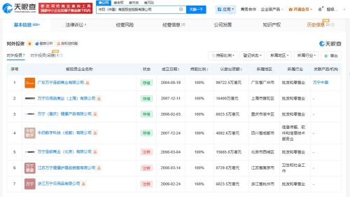 天眼查工商信息显示,万宁关联公司广东万宁连锁商业有限公司成立于2004年8月,法定代表人为胡子冠,注册资本约9.97亿港元,由牛奶(中国)商贸投资控股有限公司全资持股。分支机构信息显示,该公司拥有200余家分店,多为注销状态。