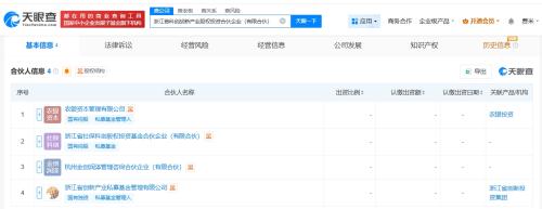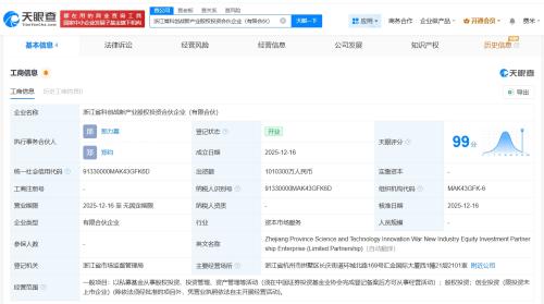 天眼查App显示,近日,浙江省科创战新产业股权投资合伙企业(有限合伙)成立,执行事务合伙人为那力嘉、郑钧,出资额101.03亿人民币,经营范围为以私募基金从事股权投资、投资管理、资产管理等活动,股权投资,创业投资,由农银资本管理有限公司、浙江省社保科创股权投资基金合伙企业(有限合伙)、杭州金创润泽管理咨询合伙企业(有限合伙)、浙江省创新产业私募基金管理有限公司共同出资。