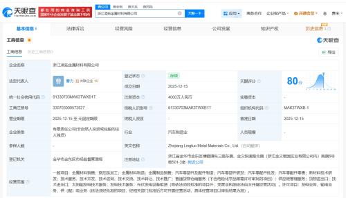 天眼查App显示,近日,浙江凌拓金属材料有限公司成立,法定代表人为曹力,注册资本4000万人民币,经营范围包括金属材料销售、钢压延加工、金属材料制造、金属制品销售等,由零跑汽车有限公司全资持股。
