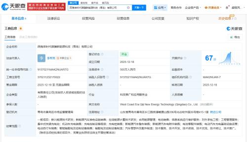 天眼查工商信息显示,近日,西海岸时代骐骥新能源科技(青岛)有限公司成立,法定代表人为李军亮,注册资本500万人民币,经营范围包括新兴能源技术研发、新能源汽车换电设施销售、在线能源计量技术研发、新能源汽车整车销售等。股东信息显示,该公司由宁德时代旗下时代骐骥新能源科技(青岛)有限公司全资持股。