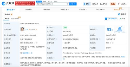 该公司成立于2019年4月,法定代表人为王在,经营范围为集成电路设计、技术开发、技术推广、技术转让、技术咨询、技术服务,计算机系统服务,软件开发,销售计算机软件、硬件及辅助设备。股东信息显示,该公司由寒武纪(688256)全资持股。