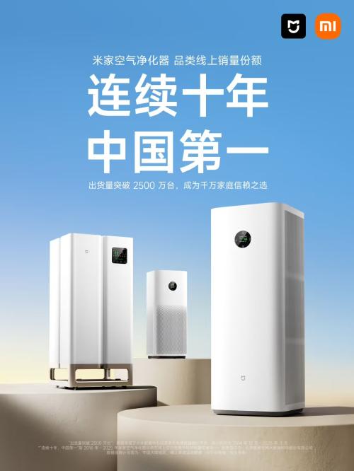小米智能生态官方今日宣布:米家空气净化器连续十年中国线上销量第一,出货量突破2500万台。