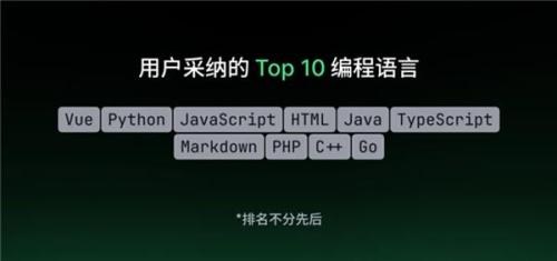 TRAE能够适配多类专业的开发场景,用户采纳的Top 10编程语言包括:Vue、Python、JavaScript、HTML、Java、TypeScript、Markdown、PHP、C++、Go。