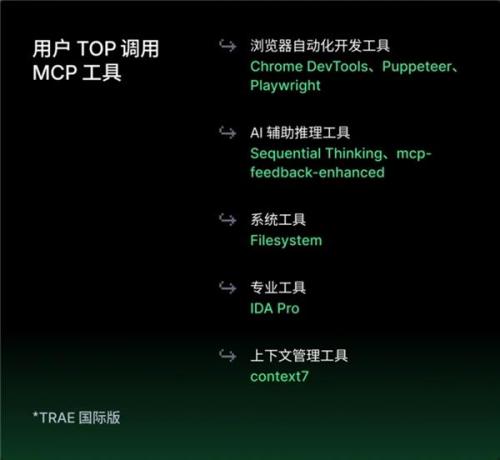目前,TRAE支持的MCP数量达1.1万个。MCP成为支撑Web自动化、全栈开发、深度代码分析等复杂场景的重要基础架构,将大模型的认知能力无缝嵌入到实际工作流中。