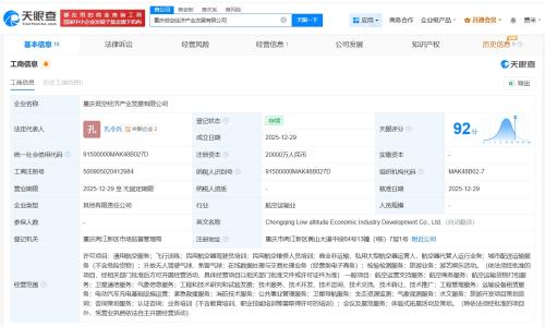 天眼查App显示,近日,重庆低空经济产业发展有限公司成立,法定代表人为孔令兵,注册资本2亿人民币,经营范围包括通用航空服务、飞行训练、民用航空器驾驶员培训等,由航天时代低空科技有限公司、重庆发展投资有限公司、重庆机场集团有限公司、重庆永川城市发展集团有限公司、重庆两江新区战新服务业私募股权投资基金合伙企业(有限合伙)共同持股。