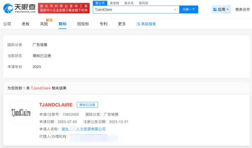 天眼查知识产权信息显示,“TJandClaire”已被湖北某人力资源有限公司申请注册为商标,国际分类为广告销售,当前商标状态为已注册。