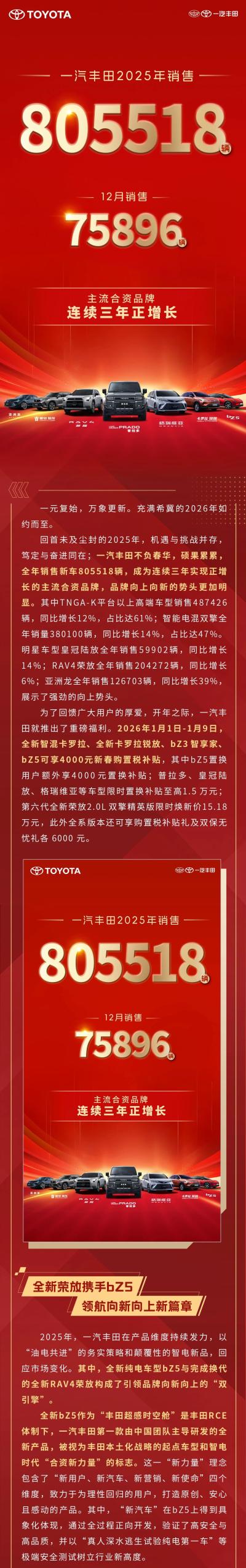 2025年一汽丰田新车销售805518辆。