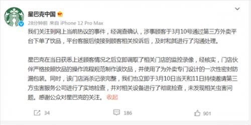 星巴克在当日获悉上述顾客情况之后立即调取了相关门店的监控录像,经核实,门店伙伴严格按照饮品的操作流程规范制作该饮品,并使用了为外卖专门设计的一次性密封防漏包装。同时,该门店消杀记录完整,我们也立即于3月10日当天和11日持续邀请第三方虫害服务公司进行了实地检查,并对相关设备进行了彻底检查,未发现相关虫害问题。感谢公众对星巴克的关注。