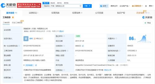 天眼查工商信息显示,近日,康师傅方便食品投资(中国)有限公司发生工商变更,企业名称变更为顶园咨询(天津)有限责任公司。