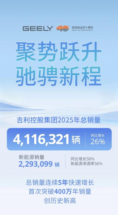 吉利控股集团今日公布2025年总销量:4,116,321辆,同比增长26%。其中新能源销量2,293,099辆,同比增长58%;新能源渗透率56%,总销量连续5年快速增长,首次突破400万年,销量创历史新高。