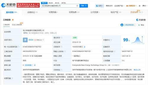 恒大新能源科技集团有限公司成立于2019年1月,法定代表人为李林林,注册资本10亿美元,经营范围包括电池及相关产品的系统集成、设备租赁、技术转让、技术服务、技术咨询、技术检测等。股东信息显示,该公司由恒大凯宏投资(深圳)有限公司全资持股。