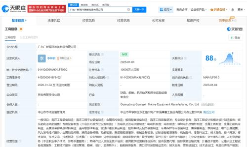 天眼查工商信息显示,近日,广东广新海洋装备制造有限公司成立,法定代表人为李祥明,注册资本1亿人民币,经营范围包括海洋工程装备制造、海洋工程平台装备制造、金属结构制造、船用配套设备制造等。股东信息显示,该公司由广东省广新控股集团有限公司、广东省粤新资产管理有限公司共同持股。