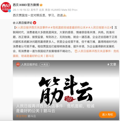 1月19日,人民日报发布评论文章《危机面前,坦诚是最好的公关》。随后,@西贝XIBEI官方微博转发评论文章,称“西贝贾国龙一定对照反思,学习,改进”。