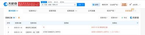 天眼查工商信息显示,近日,柒一拾壹(成都)有限公司发生工商变更,注册资本由约4.7亿人民币增至约4.8亿人民币。