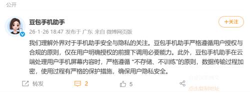 同日晚间,@豆包手机助手发文称:"我们理解外界对于手机助手安全与隐私的关注。豆包手机助手严格遵循用户授权与合规的原则,仅在用户明确授权的前提下调用必要能力。此外,豆包手机助手在云端处理用户手机屏幕内容时,严格遵循'不存储、不训练'的原则,数据传输过程加密,使用过程有严格的保护措施,确保用户隐私安全。"