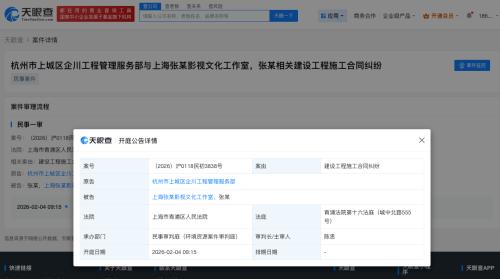 天眼查App显示,近日,原告杭州市上城区企川工程管理服务部与被告上海张翰影视文化工作室、张翰新增一则开庭公告,涉及建设工程施工合同纠纷案件,该案将于2026年2月4日在上海市青浦区人民法院开庭审理。