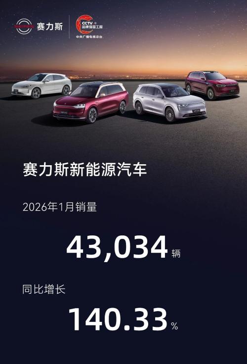 2月1日,赛力斯发布2026年1月产销快报。数据显示,赛力斯新能源汽车1月销量43,034辆,同比增长140.33%。
