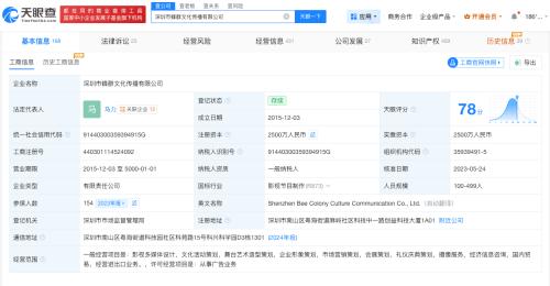 天眼查App显示,深圳市蜂群文化传播有限公司成立于2015年12月,法定代表人为马力,注册资本2500万人民币,经营范围包括影视多媒体设计、文化活动策划、舞台艺术造型策划等。