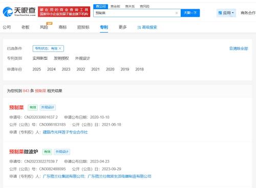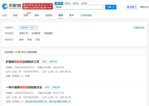 天眼查知识产权信息显示,我国目前有预制菜相关专利申请超1000件,其中800余件专利为有效状态。申请年份信息显示,2025年,我国有超百件预制菜相关专利申请,包括“一种预制菜锁鲜设备”、“一种预制菜加工的灭菌装置”、“一种预制菜装盒装置”等。