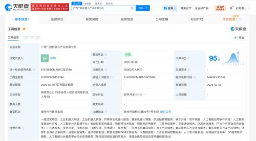 天眼查工商信息显示,近日,广西广投机器人产业有限公司成立,法定代表人为陈琛,注册资本5亿人民币,经营范围含工业机器人制造、工业机器人销售、特殊作业机器人制造、智能机器人销售、供应链管理服务、软件开发、人工智能应用软件开发、人工智能基础软件开发、人工智能公共数据平台、卫星通信服务等。股东信息显示,该公司由广西投资集团柳州数智科创有限公司全资持股。