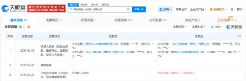 天眼查App显示,近日,TCL智能科技(宁波)有限公司发生工商变更,注册资本由6250万人民币增至约15.6亿人民币,增幅2400%。