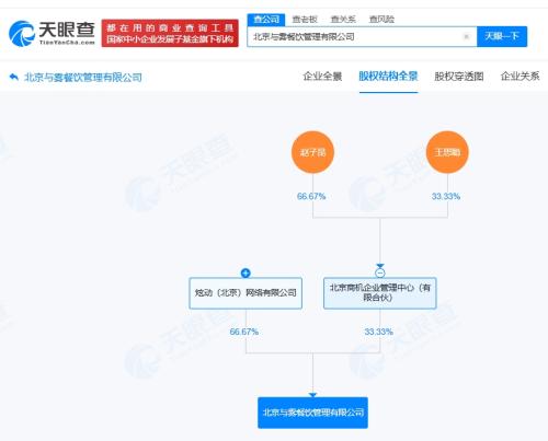 天眼查App显示,近日,北京与雾餐饮管理有限公司成立,法定代表人为许磊,注册资本100万人民币,经营范围包括餐饮管理、外卖递送服务、商业综合体管理服务等,由炫动(北京)网络有限公司、北京商机企...