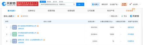 天眼查App显示,近日,深圳市金高壹号投资合伙企业(有限合伙)成立,执行事务合伙人为金惠红湖(深圳)企业管理有限公司,出资额约2.5亿人民币,经营范围为以自有资金从事投资活动、企业管理、企业管理咨询、财务咨询。合伙人信息显示,该合伙企业由泸州老窖旗下四川金舵投资有限责任公司、金惠红湖(深圳)企业管理有限公司、泸州高新创新科技有限公司共同出资。