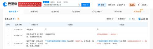 天眼查App显示,近日,庆阳云界瞬联科技有限公司发生工商变更,注册资本由1000万人民币增至约5.056亿人民币,增幅4956%。